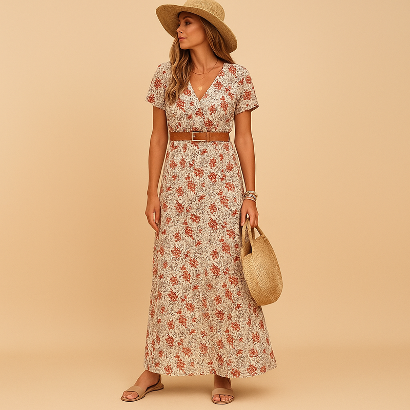 Maxi dress with V-neck and belt for women | Milou