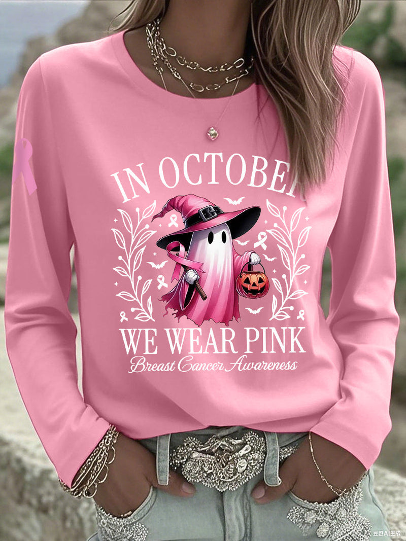 Women's In October We Wear Pink Halloween Pink Ghost Breast Cancer Awareness Support Long Sleeve T-Shirt